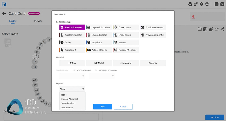 - Numériser l’occlusion L’utilisation du logiciel est facile, et le traitement des numérisations est rapide. Comme mentionné ci-dessus, il essaie de simplifier encore plus les choses avec des options « sélectionnez votre flux de travail ». Le logiciel lui-même fonctionne bien et offre une excellente visualisation ainsi que des options de partage de cas. Cependant, certaines fonctionnalités manquent ; par exemple, les options de matériau dans la fiche de laboratoire sont limitées au PMMA, au métal NP, au composite ou à la zircone. Où sont les disilicates de lithium ?