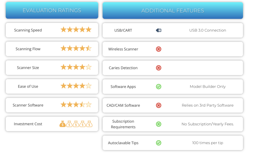 Ce scanner est l’un des scanners les plus abordables au monde, avec un PDSF de 9 500 USD. Il est assez incroyable de constater à quel point le prix des scanners a baissé au fil des ans. Ce scanner ne dispose d’aucun logiciel de CAO ni d’applications logicielles. Il est uniquement utilisé pour la numérisation et l’exportation, qui peuvent ensuite être importées dans des logiciels de conception CAD tiers tels qu’exocad.