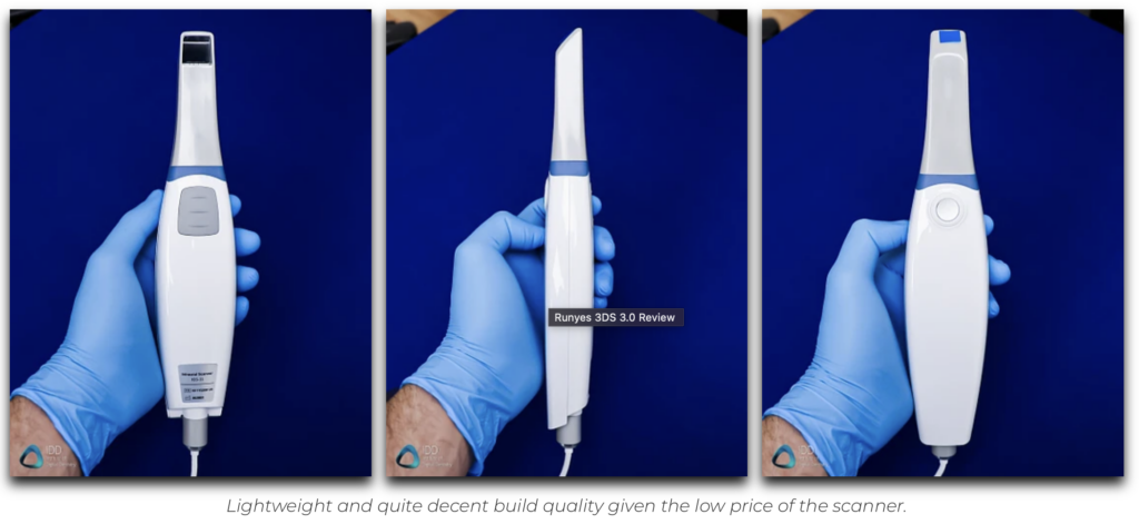 Le Runyes 3DS 3.0 est très léger, pesant 210 grammes, soit moins que la plupart des autres scanners sur le marché. Pour référence, les poids d’autres scanners dans cette gamme de prix sont : Heron IOS (150 grammes), Medit i700 (245 g), Medit i500 (280 g), et Shining 3D Aoralscan 3 (240 g). Les scanners plus chers sur le marché sont beaucoup plus lourds que le Runyes 3DS 3.0, tels que le 3Shape TRIOS 4 (340g), CEREC Primescan (457 – 525g), ou iTero Element 5D (~500g).